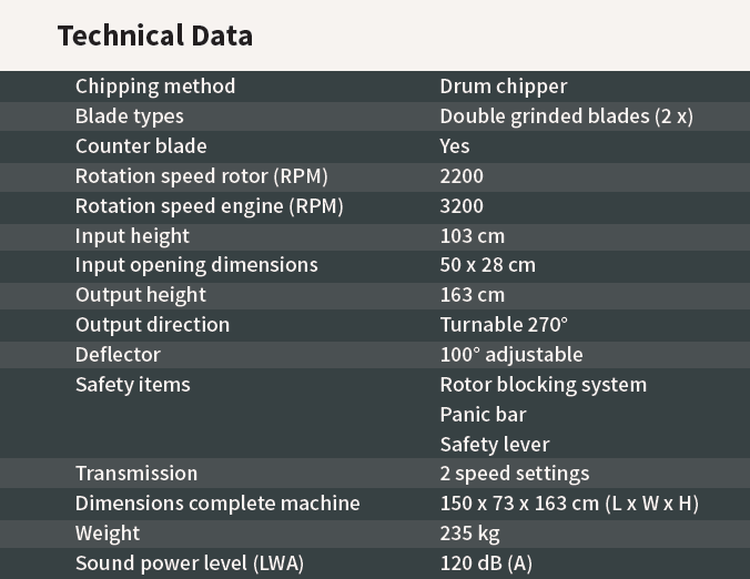 The battery powered (2 x 12 V) self-propelled system has an impressive autonomy of 9.5 kms on flat paved ground and approximately 3 kms on hilly or muddy terrain. It has two speeds forward (3 and 6 km/h) and two reverse speeds (1.5 and 3 km/h). The driving system can handle slopes up to 15°, so you can easily drive it in a van or onto a trailer. Steering is no hassle thanks to the two swiveling wheels that are mounted on a swingaxle so one can drive the chipper through rough and uneven terrain. The 270° turnable output chute makes the disposal of chips easy.Despite of its performance and robust construction, it still passes through all regular garden gates (width only 73 cm)!