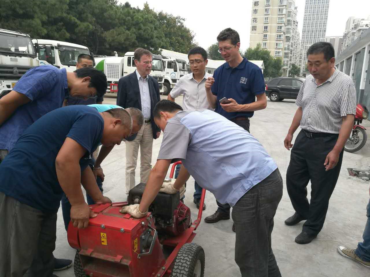注:威而德公司創(chuàng)始人Mr. Joseph de Wild與銷售總監(jiān)Mr. Tijl van den Bosch在日照園林局養(yǎng)護(hù)公司調(diào)研碎枝機(jī)使用情況。