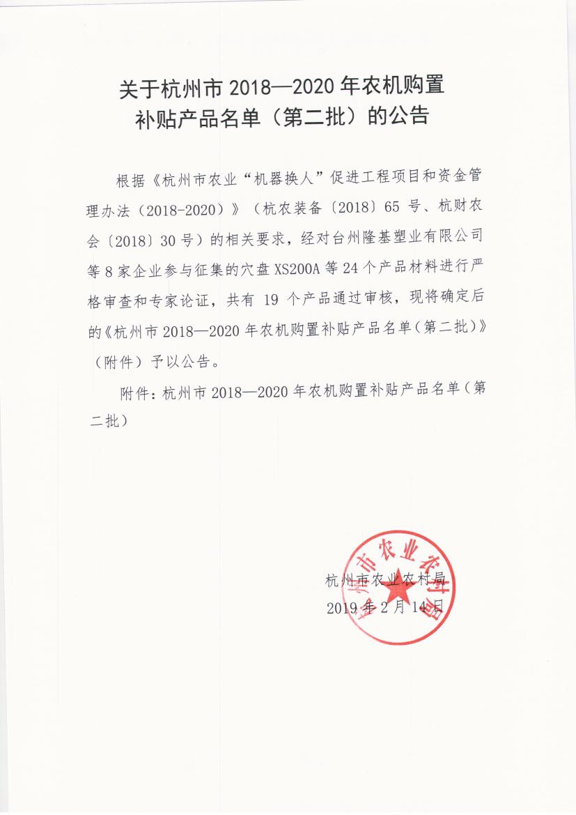 杭州市農(nóng)業(yè)農(nóng)村局《關(guān)于杭州市2018-2020年農(nóng)機(jī)購(gòu)置補(bǔ)貼產(chǎn)品名單(第二批)的公告》