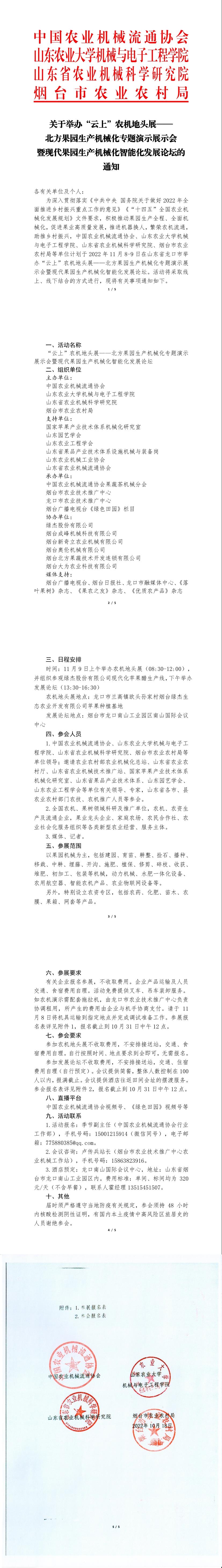 為深入貫徹落實(shí)《中共中央 國(guó)務(wù)院關(guān)于做好2022年全面推進(jìn)鄉(xiāng)村振興重點(diǎn)工作的意見》《“十四五”全國(guó)農(nóng)業(yè)機(jī)械化發(fā)展規(guī)劃》文件要求,積極推動(dòng)果園生產(chǎn)全程、全面機(jī)械化,促進(jìn)果業(yè)高質(zhì)量發(fā)展,推進(jìn)機(jī)器換人,繁榮農(nóng)機(jī)流通,助推鄉(xiāng)村振興,中國(guó)農(nóng)業(yè)機(jī)械流通協(xié)會(huì)、山東農(nóng)業(yè)大學(xué)機(jī)械與電子工程學(xué)院、山東省農(nóng)業(yè)機(jī)械科學(xué)研究院、煙臺(tái)市農(nóng)業(yè)農(nóng)村局等單位計(jì)劃于2022年11月8-9日在山東省龍口市舉辦“云上”農(nóng)機(jī)地頭展——北方果園生產(chǎn)機(jī)械化專題演示展示會(huì)暨現(xiàn)代果園生產(chǎn)機(jī)械化智能化發(fā)展論壇?;顒?dòng)將采取線上、線下結(jié)合的方式進(jìn)行,現(xiàn)將有關(guān)事項(xiàng)通知如下。