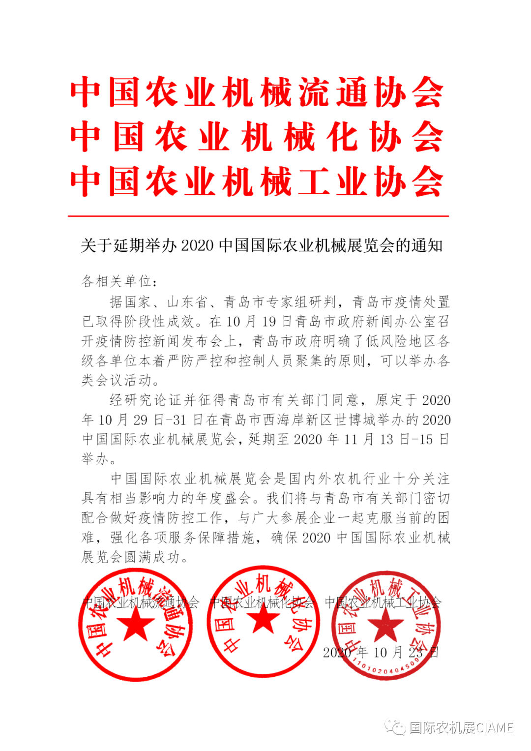 經(jīng)研究論證并征得青島市有關部門同意,原定于2020年10月29日-31日在青島市西海岸新區(qū)世博城舉辦的2020中國國際農(nóng)業(yè)機械展覽會,延期至2020年11月13日-15日舉辦。