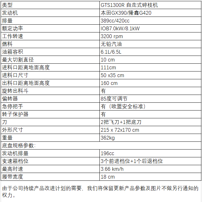 GTS1300R符合歐盟安全認(rèn)證標(biāo)準(zhǔn)。配有旋轉(zhuǎn)出料斗,在偏轉(zhuǎn)器的作用下可將碎木片噴向指定 地點(diǎn),粉碎物高位噴出,更方便收集。